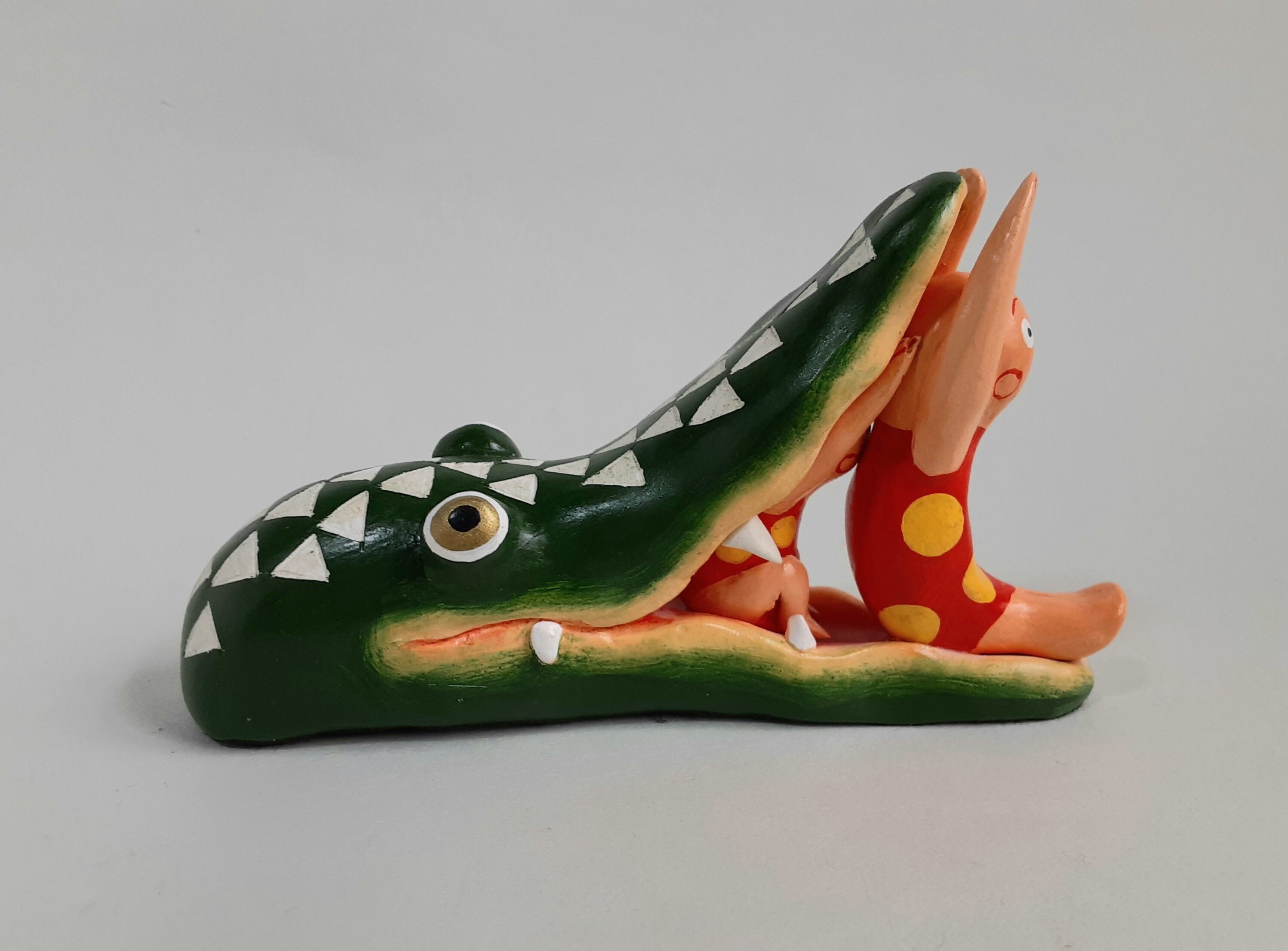 ワニと二人の兄弟は仲良し。ワニの背中部分には、ウロコ柄に削っています。