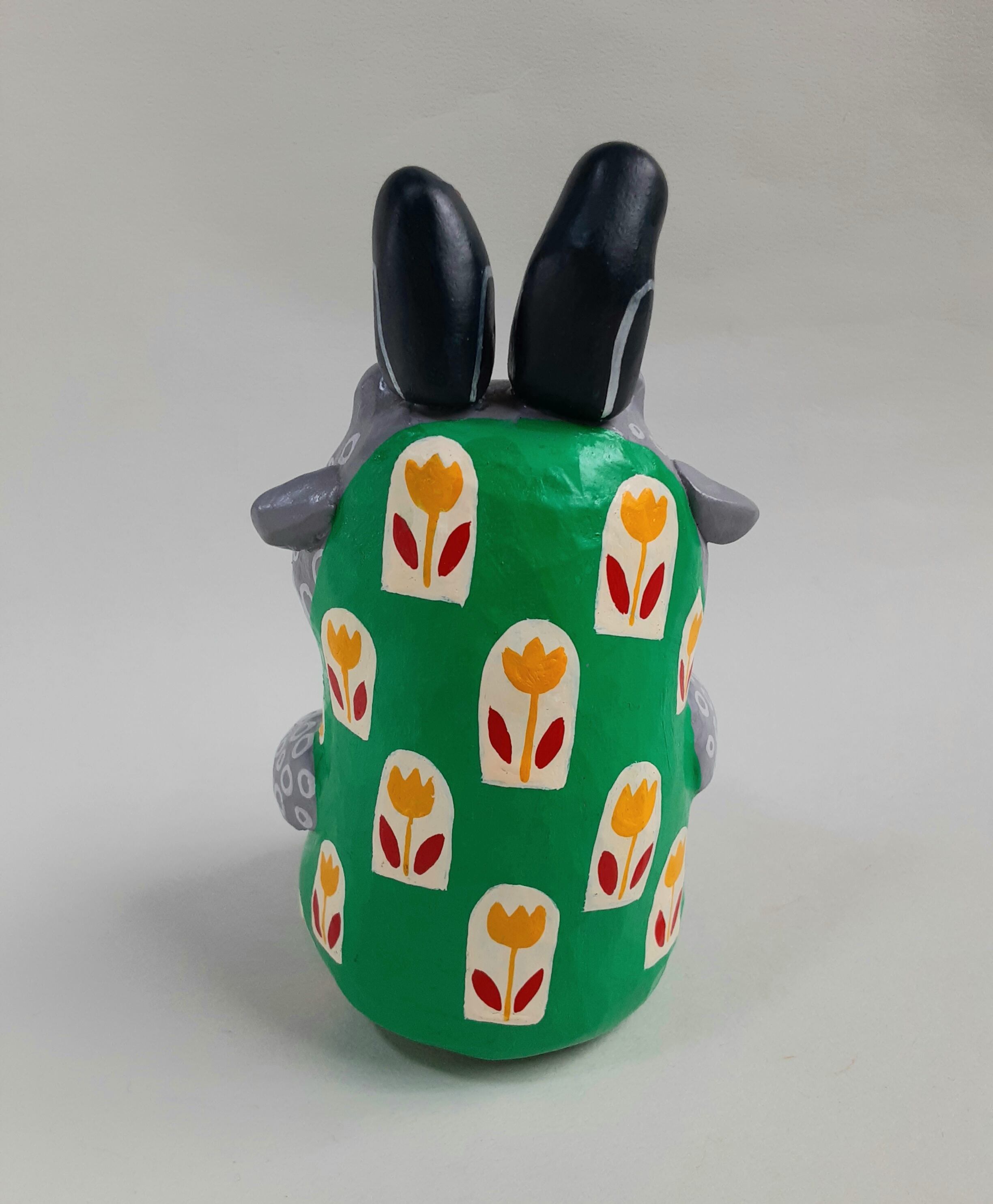 優しいカバさんにつばめがとまってます。カバは、花柄のベストをきています。